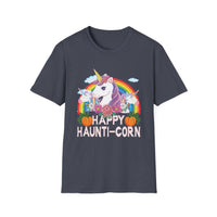 Happy Haunti-Corn Unisex Softstyle T-Shirt | Fun Unicorn Halloween Tee, Gifts for Fall, Cozy Casual Wear, Holiday Apparel, Playful Designs